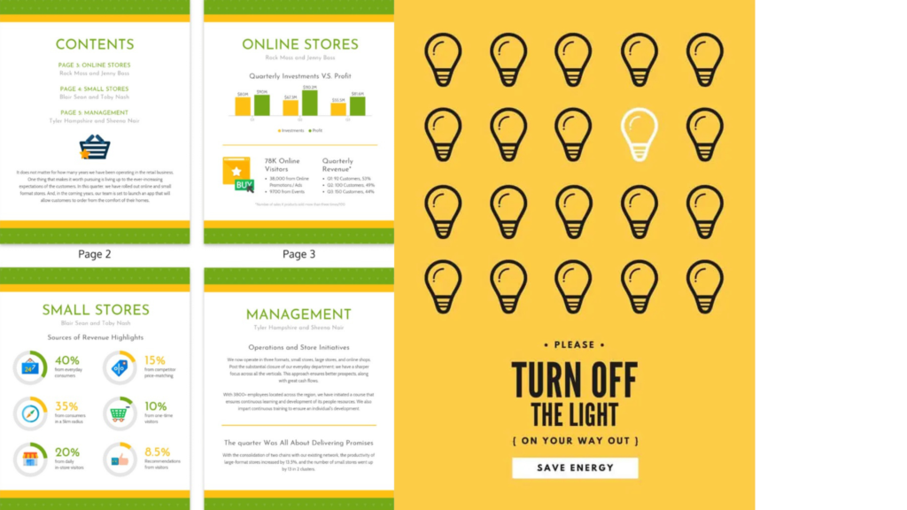 - Lining up charts, icons, headings, and text in clear columns and rows